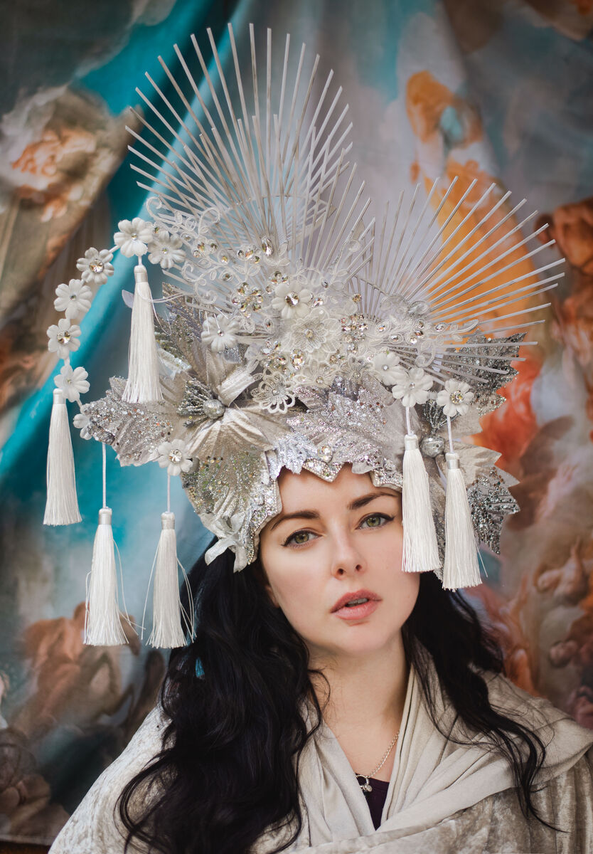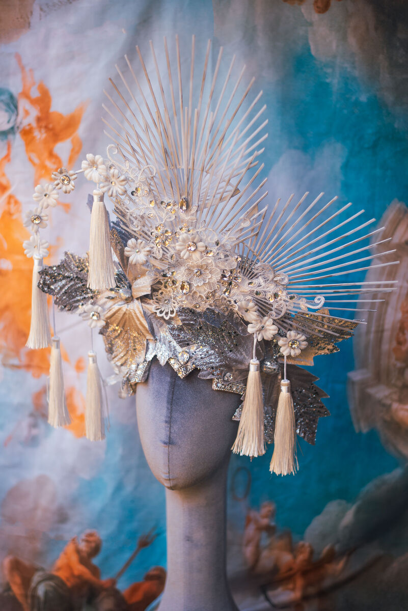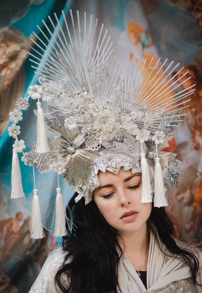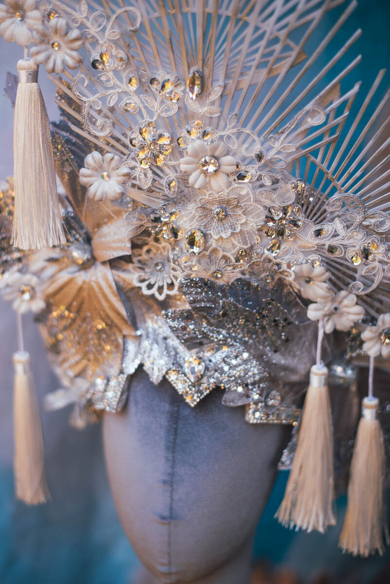 This captivating headdress is a true showstopper, expertly crafted from a luxurious blend of soft yet resilient cotton velvet. It features a breathtaking fan-like design, rendered in a pristine white hue and delicately brushed with shimmering silver accents, evoking a sense of ethereal elegance. Adorned with twinkling crystals that catch the light with every movement, this piece sparkles like a constellation, complemented by enchanting silver glitter flowers that add whimsical charm. Cascading white tassels gracefully sway with each turn, infusing the headdress with dynamic movement. This unique accessory is a stunning embodiment of artistry and sophistication, perfect for making an unforgettable impression.